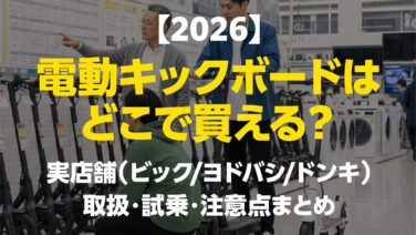 ニュース・技術動向 電動キックボードはどこで買える?実店舗(ビック/ヨドバシ/ドンキ)取扱・試乗・注意点まとめ【2026】 「電動キックボード、高い買い物だから実物を見てから買いたい」「今日すぐに乗って帰りたいから、ドンキかビックカメラに行こうかな?」そう思って家を出る前に、一つだけ知っておいてほしい「不都合な真実」があります。学生「えっ、お店で見てそのまま買う... 2025.05.12 ニュース・技術動向初心者ガイド・使い方活用術・Q&A